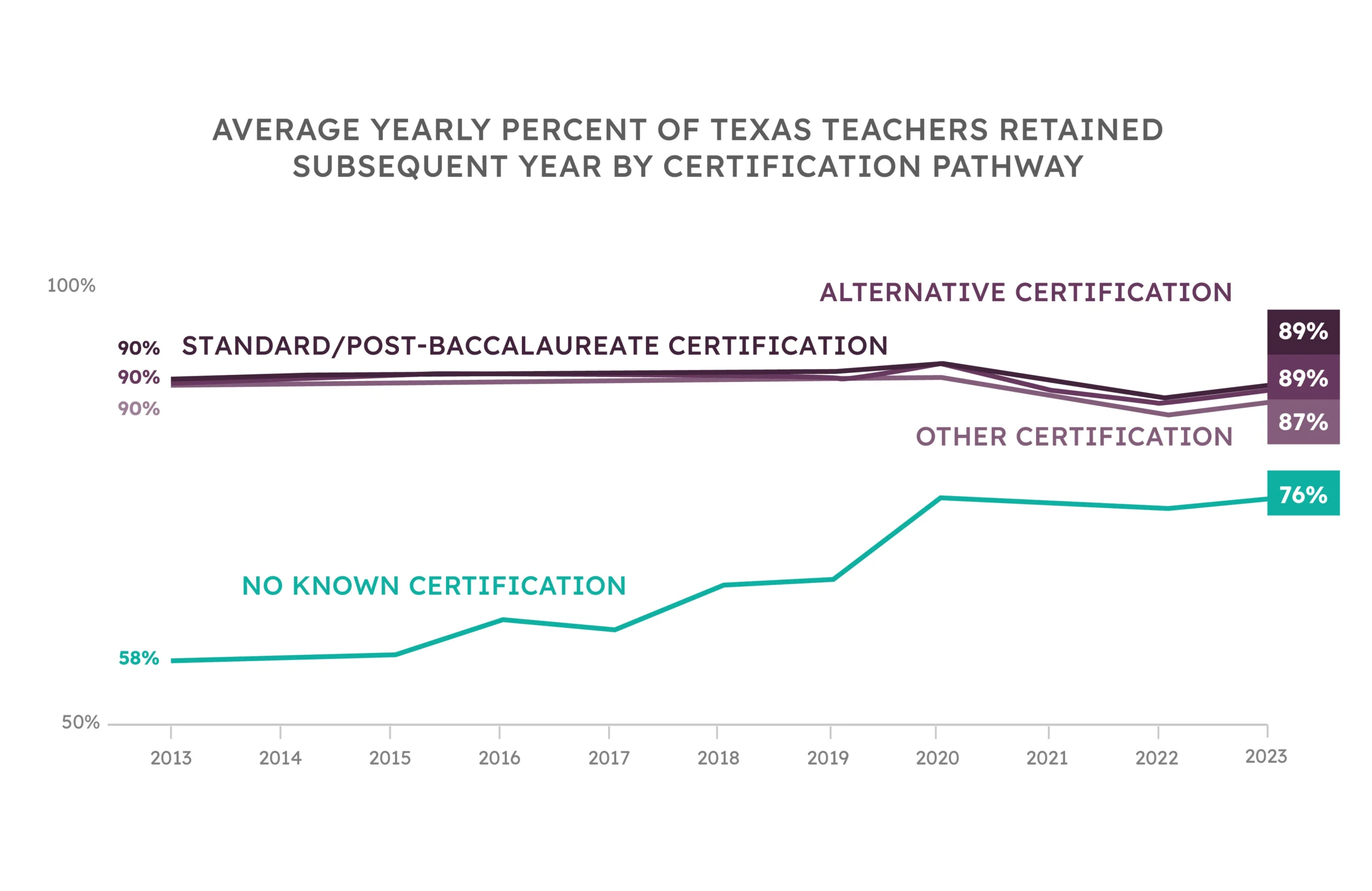 The data also revealed that attrition rates are highest for Texas teachers with “No Known Certification.” The percentage of teachers without a known certification is small but growing. They comprised less than 1% of the state’s teacher workforce in 2013 but grew to 6.1% by 2023. E3 found teachers with “No Known Certification” are 70% less likely to stay in the classroom than educators who have earned a standard certification, meaning they participated in an Educator Preparation Program that had a student-teaching component.